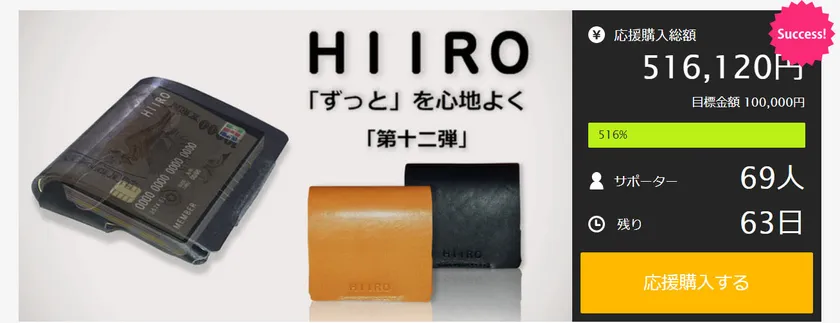 HIIRO's Leather seriesでは、大容量『二つ折り財布』の小型化新記録を打ち出すべくプロジェクトをスタート、2021年7月2日よりMakuake(マクアケ)にてクラウドファンディング支援者募集を開始しました。公開初日に目標金額を達成し、商品化が決定しました。
