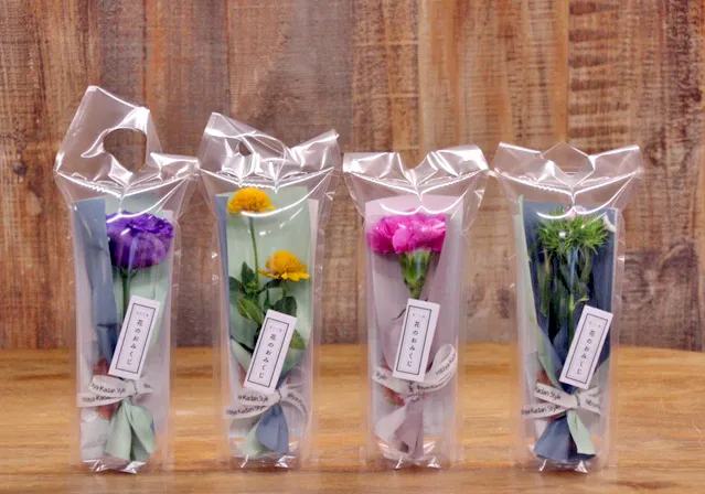 「花の自動販売機」限定で購入できる、花みくじ付き「フォーチュンフラワー」は、空気を充填しておすすめの生花1本を特殊ラッピングした商品で、植物自体の水分で栄養をまかない、水のない状態でも長持ちします。空気のクッションで保護することによって、混み合う電車の中でも花を傷つけることなく安心してお持ち帰りいただけます。ラッピングから出さずにそのままでも飾っていただけますが、開封し、水を入れた花瓶に飾るとより長く楽しむことができます。また、「フォーチュンフラワー」にはその日の運勢を試せる花みくじがついています。「満開」から「7分咲き」、「5分咲き」、「3分咲き」、「つぼみ」までの5種類の運勢と、仕事、恋愛、友情に関する一言アドバイスを掲載。「満開」が出たら、近くのフラワーショップ「ルコネル 小田急マルシェ新宿店」で季節の花1本と交換できます。