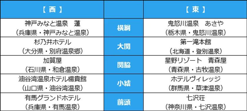 温泉地部門は、東の横綱は13年連続で草津温泉(群馬県)、西の横綱は6年連続で別府温泉郷(大分県)となりました。旅館・ホテル部門では、東は鬼怒川温泉 あさや(栃木県)が、昨年に続き首位の座を守り、西は神戸みなと温泉 蓮(兵庫県)が初の横綱に輝きました。