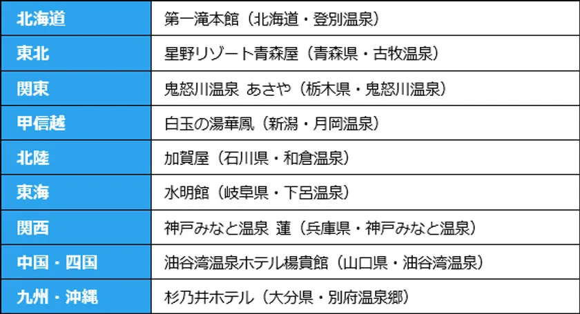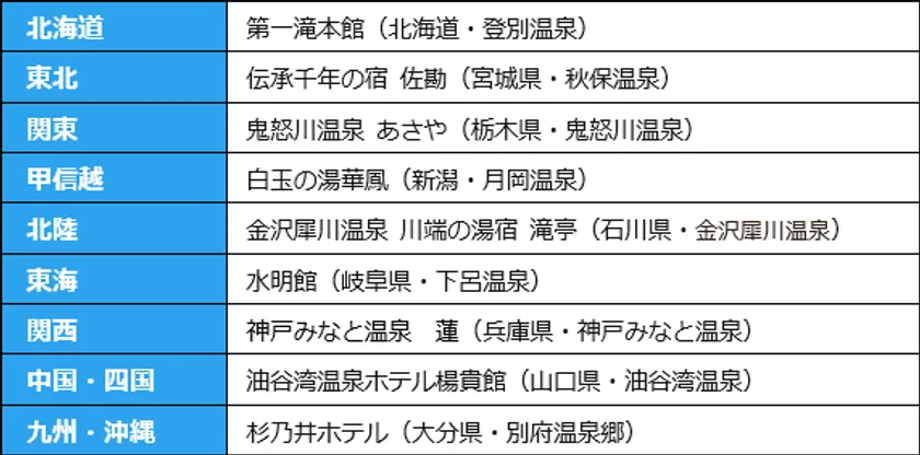 東北エリアの星野リゾート青森屋(青森県・古牧温泉)、関西エリアの神戸みなと温泉 蓮(兵庫県・神戸みなと温泉)、中国・四国エリアの油谷湾温泉ホテル楊貴館(山口県・油谷湾温泉)が初の1位に輝きました。