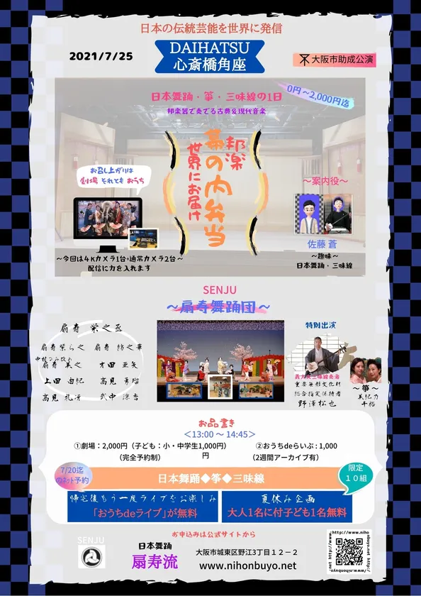 日本舞踊 扇寿流(SENJU舞踊団、事務所所在地:大阪府大阪市、二代目家元:扇寿栄之丞)は、大阪市助成金公演として、日本の伝統芸能を世界に発信する「邦楽の泉 ~邦楽幕の内弁当」を、2021年7月25日(日)に大阪・DAIHATSU心斎橋角座にて開催します。本公演はネット鑑賞も可能です。