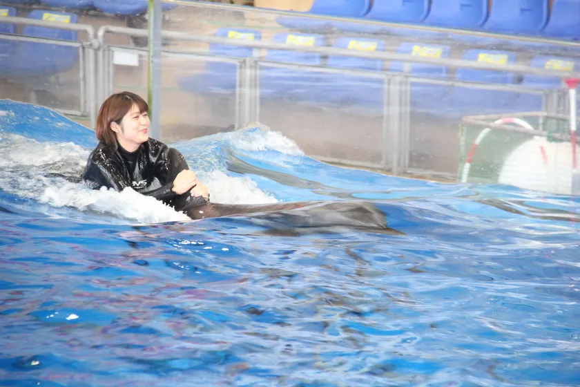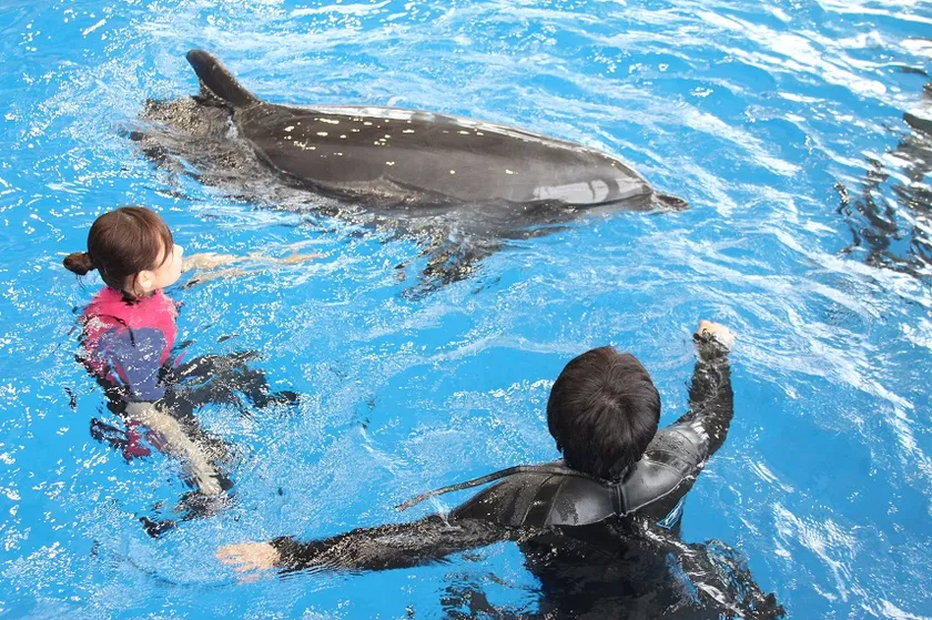アクアワールド・大洗のイルカたちを見て、触れて、一緒に泳ぐことができる人数限定のスペシャルイベントです。