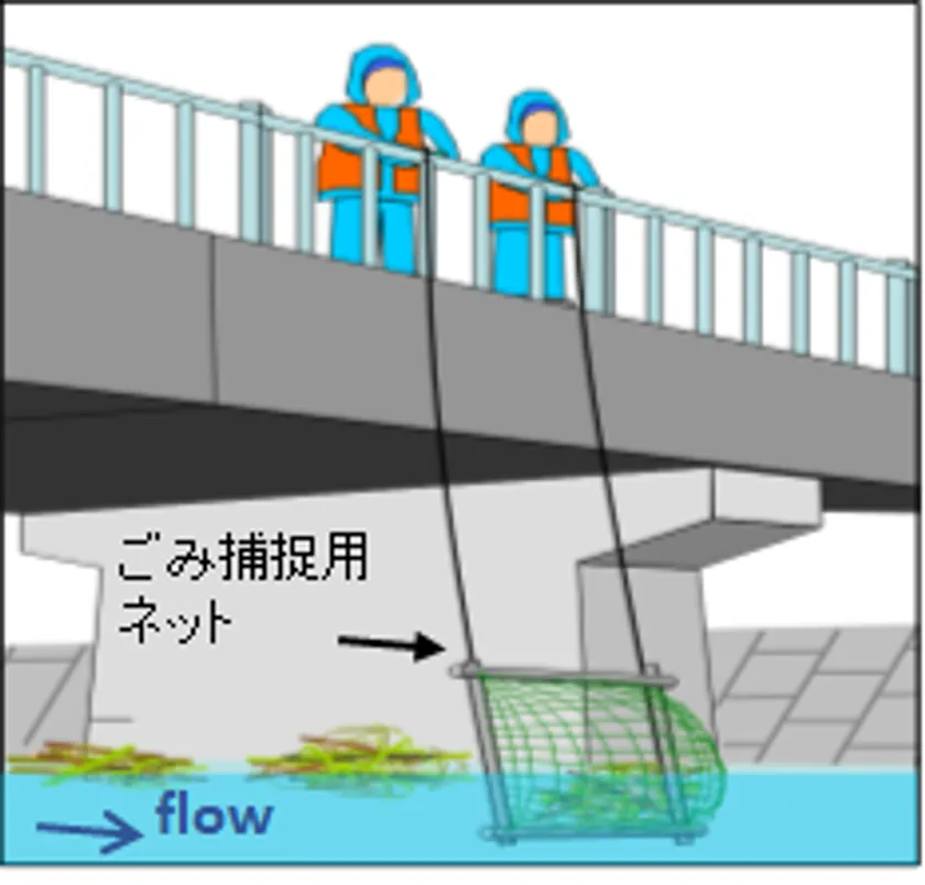従来の川ごみ輸送量の測定方法は、人的な直接的サンプリング(下図)ですが、安全面や作業負担、コスト面、また川ごみは出水時に多く流出するため、急な対応が難しい等の課題がありました。