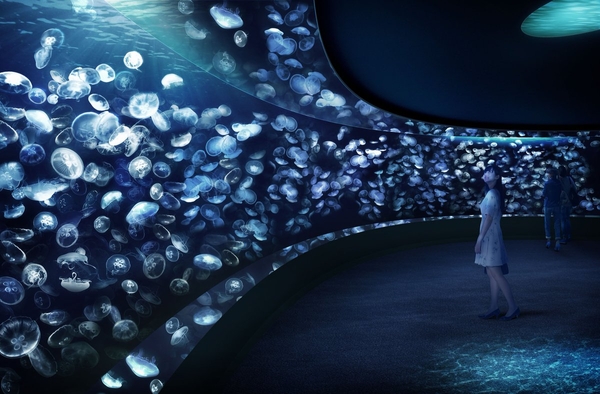 020年7月9日オープン。国内最大級(注1)の横幅となるミズクラゲの展示水槽などを新設し、水槽の形状や水流、照明、音など空間全体にこだわりを持ち、クラゲの最大の魅力である「浮遊感」や「ゆったり感」をより一層感じていただけるエリアです。その中でも、クラゲの展示としては国内最大級(注1)となる約14mの横幅を持つミズクラゲの展示水槽は、大きく弧を描いた形となっており、視界いっぱいにクラゲが広がります。まるで暗い海の中でクラゲに包まれるような圧倒的な没入感をご体験いただけます。