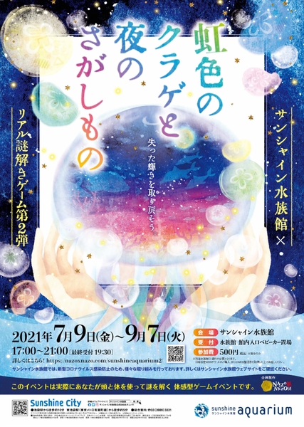 通算200企画以上を誇るリアル謎解きゲーム制作専門の株式会社ハレガケ(本社:東京都豊島区、代表:黒田洋介)は、株式会社サンシャインエンタプライズ(所在地:東京都豊島区)と池袋・サンシャインシティにあるサンシャイン水族館で、クラゲエリア「海月空感 (くらげくうかん)」のオープン1周年記念イベントとして、リアル謎解きゲーム第2弾「虹色のクラゲと夜のさがしもの」を2021年7月9日(金)から9月7日(火)にかけて開催します。