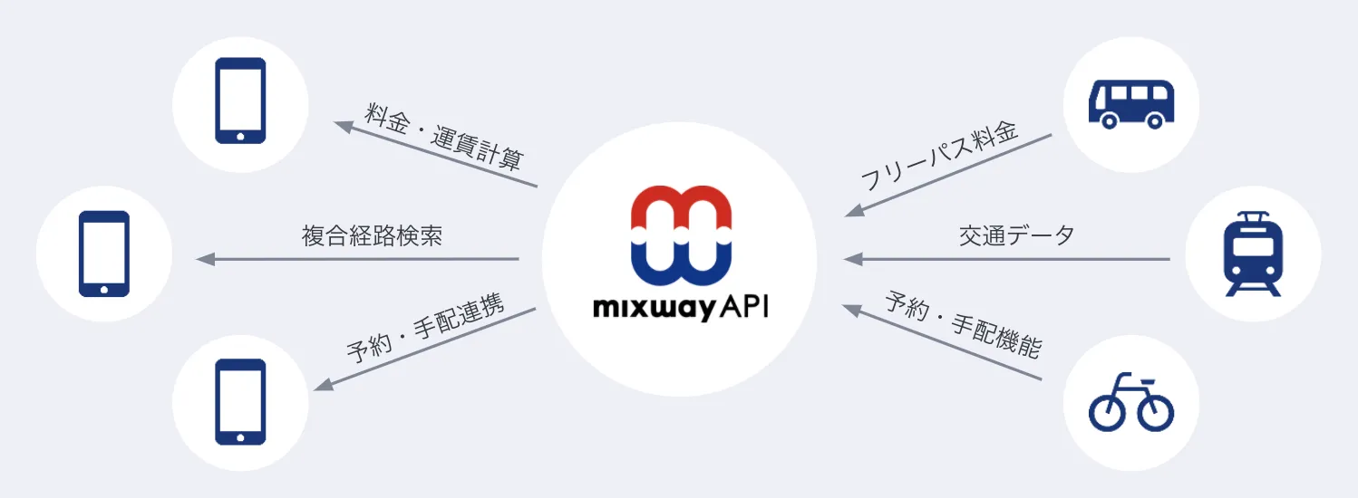 「mixway API」は、MaaSに即したサービスを素早く構築できる、MaaSプレイヤーのためのAPIサービスです。Webサイトやアプリに組み込むことで、多様な移動手段を組み合わせた“複合経路検索”や、販売チケットに応じた“フリーパス区間判定”などを容易に実装することができます。