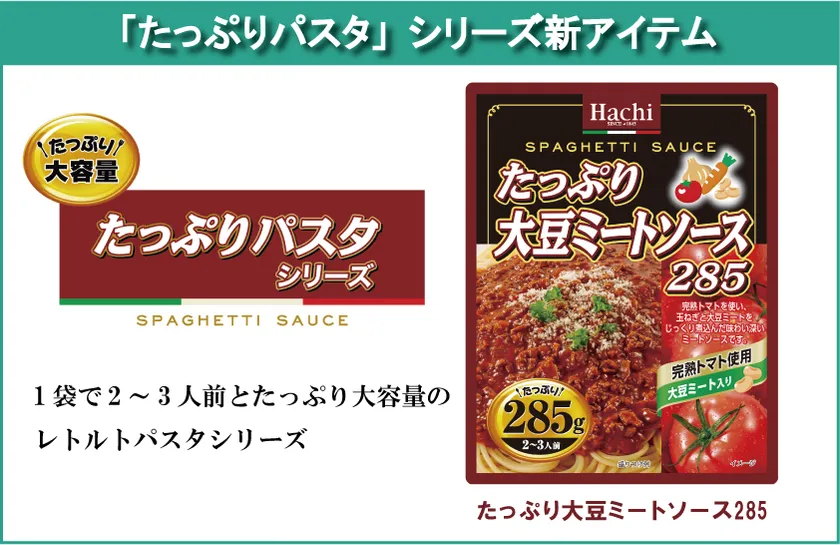 ハチ食品株式会社(大阪府大阪市、代表取締役社長:高橋 慎一)は、当社が展開するたっぷり大容量のレトルトパスタソースシリーズ『たっぷりパスタ』の新商品として、「たっぷり大豆ミートソース285」を2021年8月2日(月)に発売いたします。