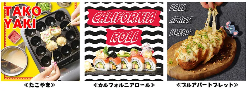体験会ではタコパ感覚が楽しめる自分で作れる「たこやき」をはじめ、「カルフォルニアロール」「プルアパートブレット」「カラフルえびせん」の4品をご提供させていただきます。この他に気になるメニューがございましたら体験会当日にご注文も可能です。