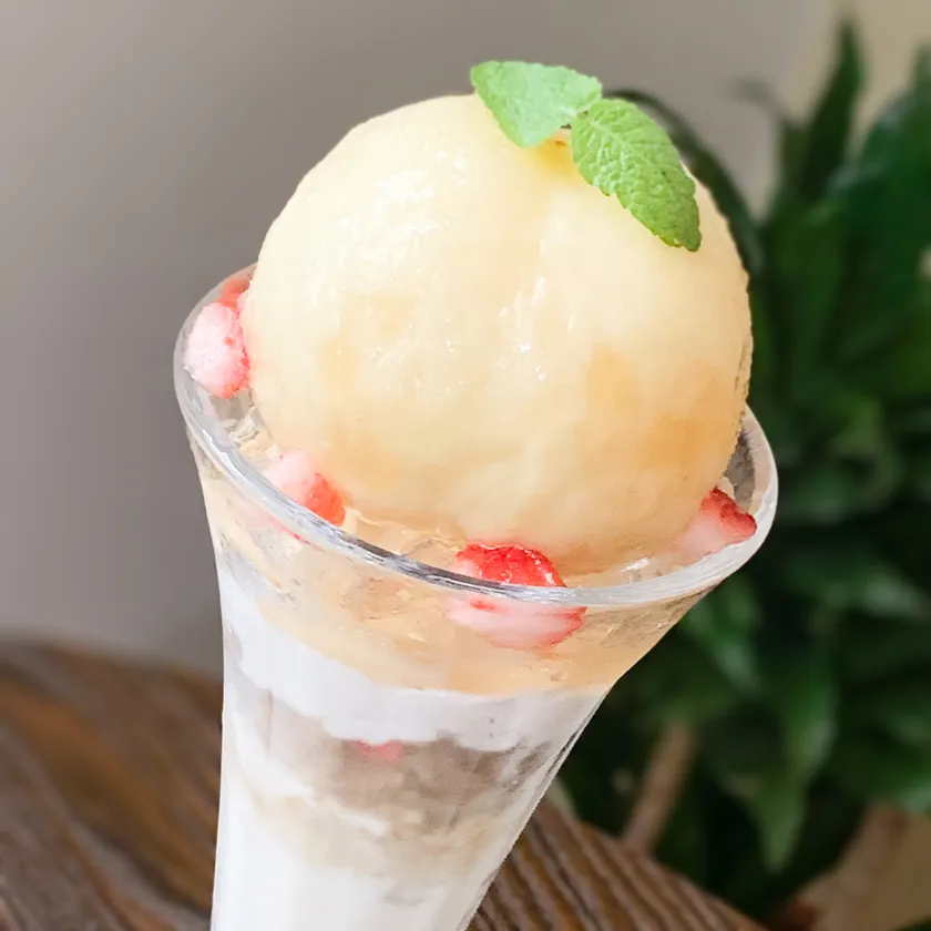 内容 :岡山県産白桃をまるごと1個トッピングした贅沢なスイーツです。