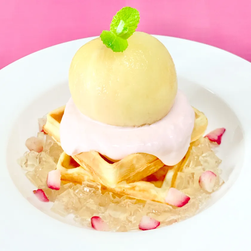 「まるごと白桃ワッフル」は、ピンクのクリームチーズを使ったソースはほんのりといちごの甘さが感じられる優しい味わいで、サクサクなワッフルと相性抜群です。