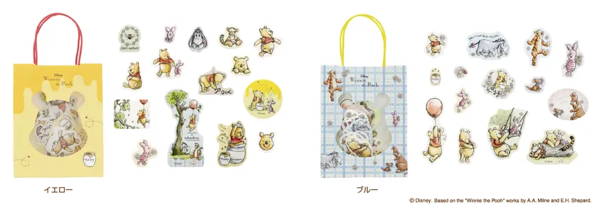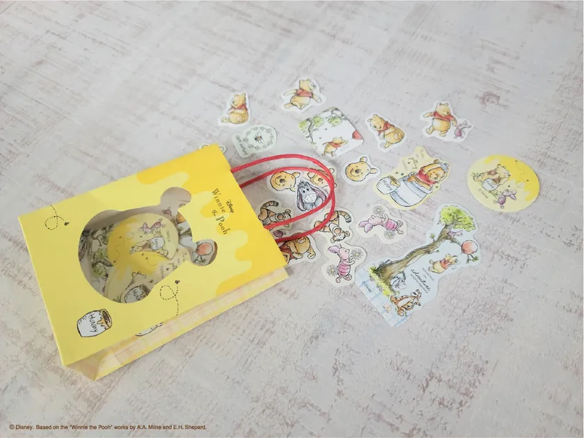 プーさんのシルエットが窓になったミニペーパーバッグ付きシール。プーさんや仲間たちの愛嬌あるポーズや表情が可愛い全15柄入ったダイカットシールです。