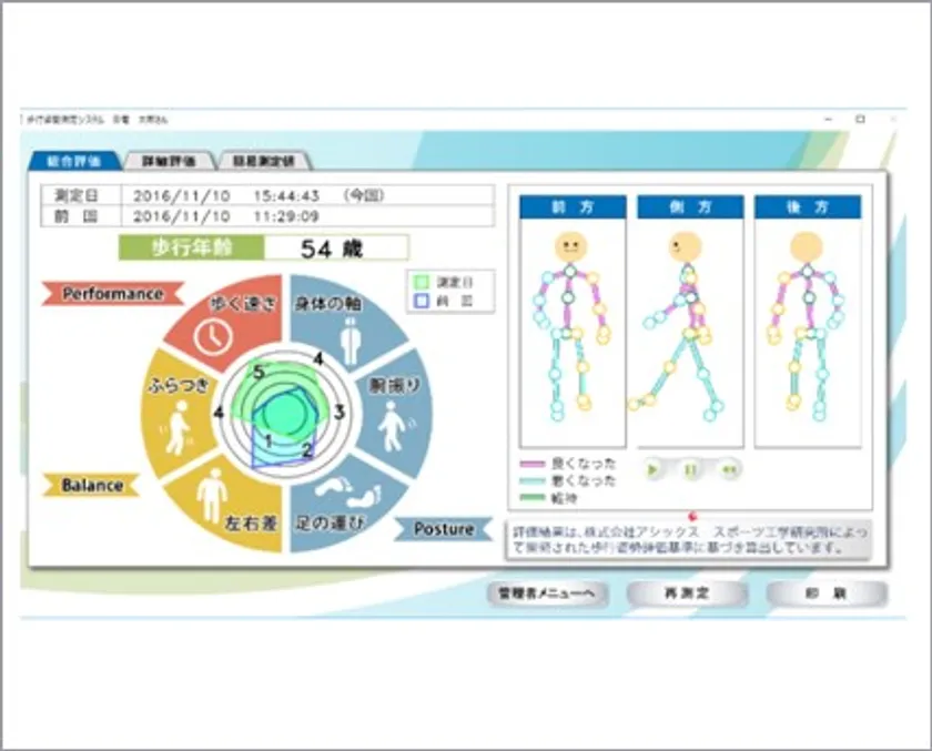 「歩行速度」「揺れ」「左右差」「身体の軸」「腕振り」「足の運び」の6つの分野に分け、5段階で点数を表示します。年齢・性別の平均と比較することができ、改善すべきポイントが具体的にわかります。企業の工場作業員の転倒予防施策として、また介護施設でのリハビリなど幅広くご使用できる機器になります。