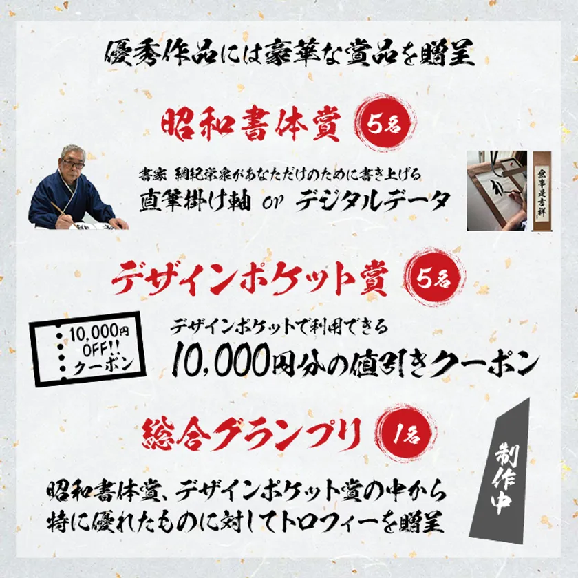 ご応募いただいた作品の中から、昭和書体賞として5名の方に書家 綱紀栄泉があなただけのために書き上げる 直筆掛け軸 or デジタルデータ(希望の文字 (10文字まで) と雰囲気をご指定いただけます)を、またデザインポケット賞として5名の方にdesignpocket.jpでのお買い物でご利用いただける10,000円分のクーポンを贈呈します。