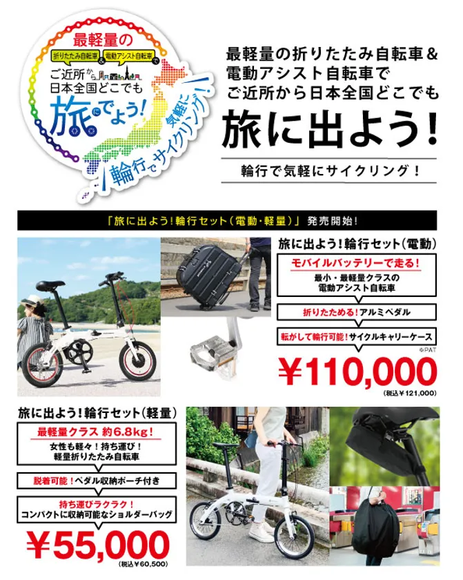 最軽量の折りたたみ自転車&電動アシスト自転車で ご近所から日本全国どこでも旅に出よう! 「旅に出よう!輪行セット(電動・軽量)を2021年7月上旬に発売 ~輪行で気軽にサイクリング~