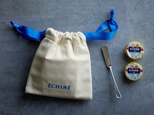 内容:エシレ ロゴ入り保冷巾着袋、エシレ バター 30gポーション×2個、エシレ 刻印入りバターナイフ ※ “デギュステ!” リーフレット付き