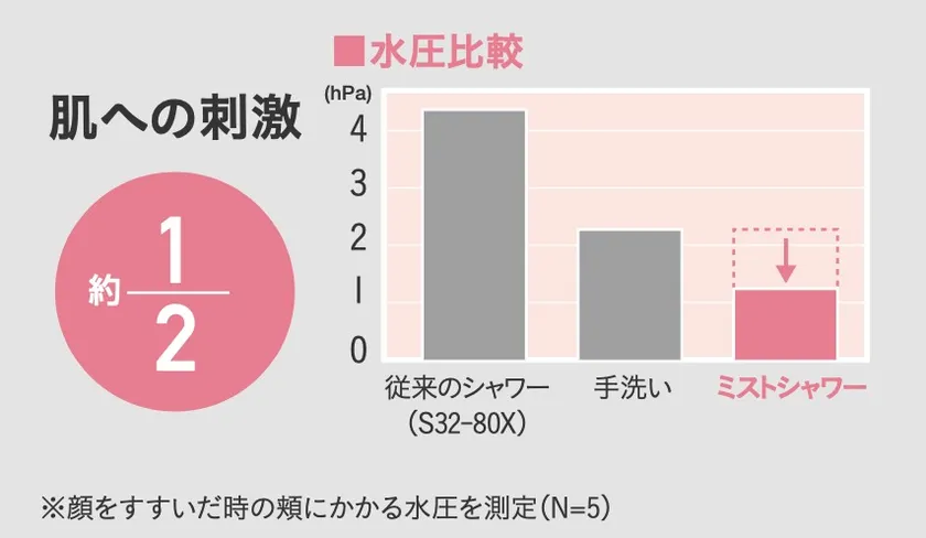 ミスト水流が頬に与える水圧は、通常のシャワーの約1/4、そして手洗いの約1/2。肌への刺激を最小限に抑え、負担をかけずに洗顔できます。