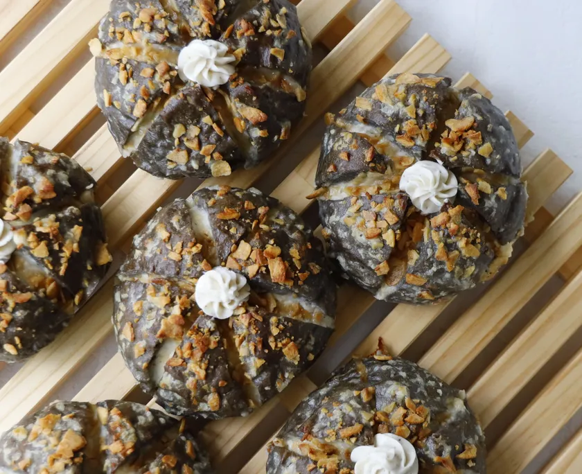 見た目は黒くインパクト抜群!ガーリック×クリームチーズの罪悪感はそのまま、甘さを控えた黒い罪悪パンです。黒こしょうと隠し味の黒にんにくで、深い旨味と芳醇な風味をプラス、より罪深き味わいをお楽しみください。