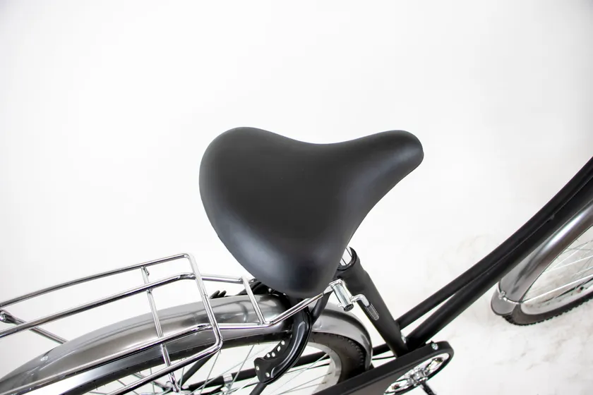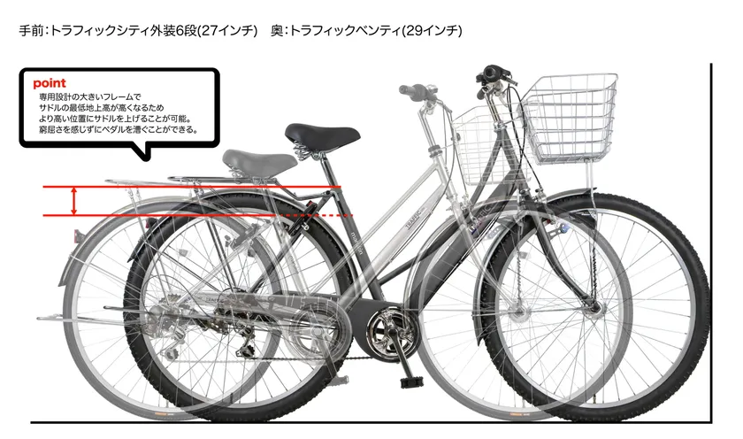 そのような悩みを持つ方に向けて、トラフィックベンティでは同シリーズのトラフィックシティ外装6段(27インチ)と比較してサドル最低地上高が約5cm高くなるようフレームを新しく設計しました。このほか、ビッグシルエットタイヤの高いエアボリュームや大きな座面のクッションサドルによって体の大きい方にも快適な乗り心地を提供します。発売後は体が大きい方や身長が高い方から反響をいただき、多くの方に愛用していただいています。