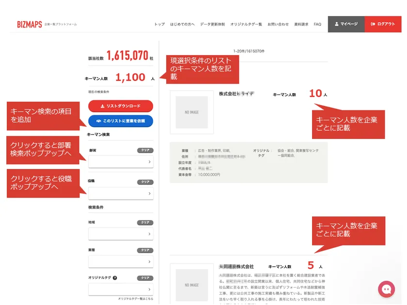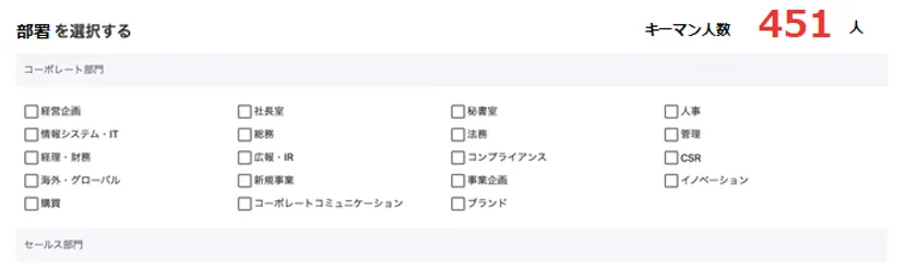 最近では、「社長だけではなく、特定部署管轄の取締役や役員に直接アプローチしたい」という多数のご要望を反映し、“キーマン検索機能”を新規搭載しました。