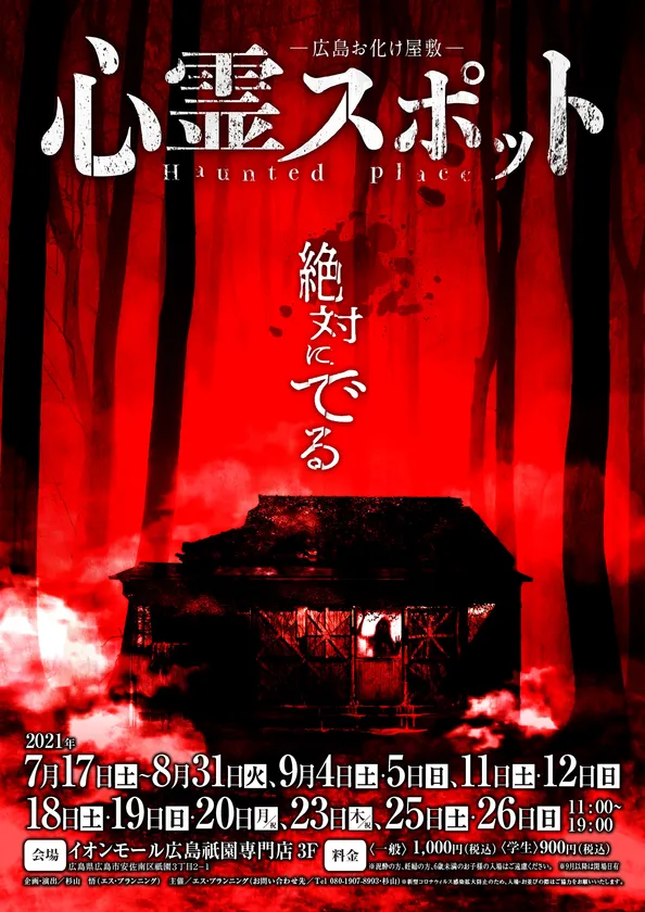 イベント企画 エス・プランニング(所在地:広島県広島市、代表:杉山 悟)は、2021年7月17日(土)~9月26日(日)の期間中、「広島お化け屋敷心霊スポット」をイオンモール広島祇園で開催いたします。