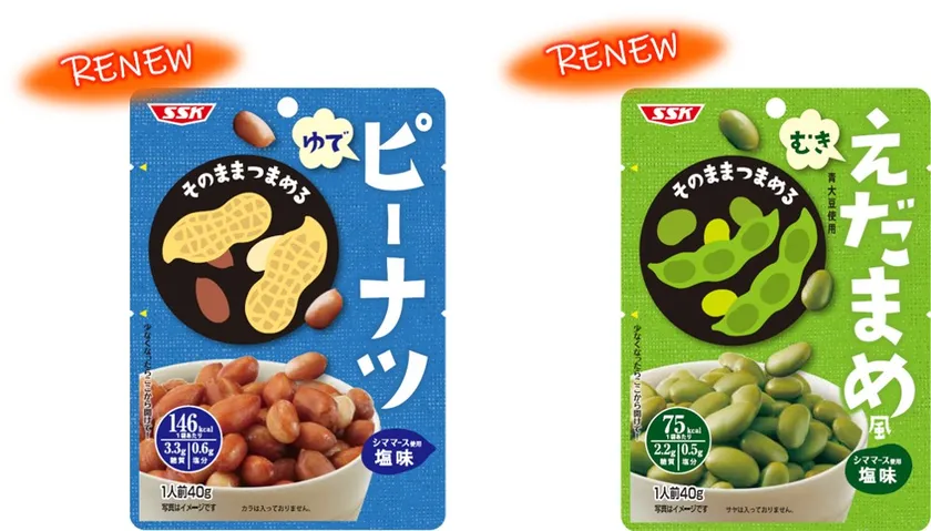 パッケージをリニューアルし手にとりやすいデザインに変更しました。「殻」や「さや」をむいてあり、開けたらそのまま、手でつまんでお召し上がりいただけます。
