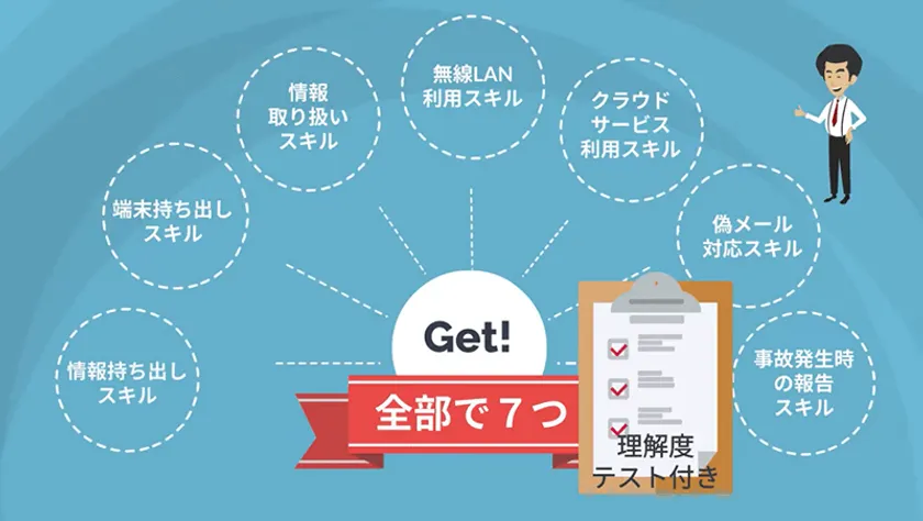 【内容】情報セキュリティに関わるモラルやリテラシーの向上を目的としたコースです。組織内個人として身につけるべき「情報セキュリティ」とは何か、を学習します。 社員・職員への定期的な教育におすすめのコースです。
