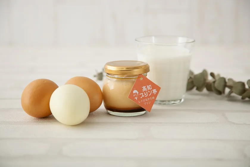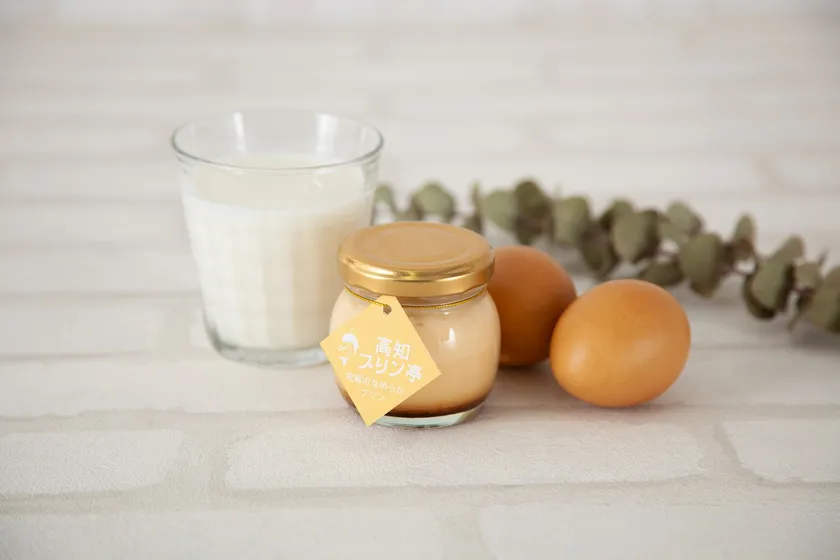 毎朝仕入れる高知県産の新鮮な牛乳と、国産の卵、生クリーム、マダガスカル産の最高級バニラビーンズを使用した究極のなめらかプリンです。とろ~りとろけるなめらかな食感をどこまでも追求しました。当店のプリンは、店内の工房でスタッフが1つ1つ心を込めて製造しています。保存料、着色料、香料、乳化剤は無添加で、お子様からご年配の方まで召し上がっていただける安心・安全なプリンです。