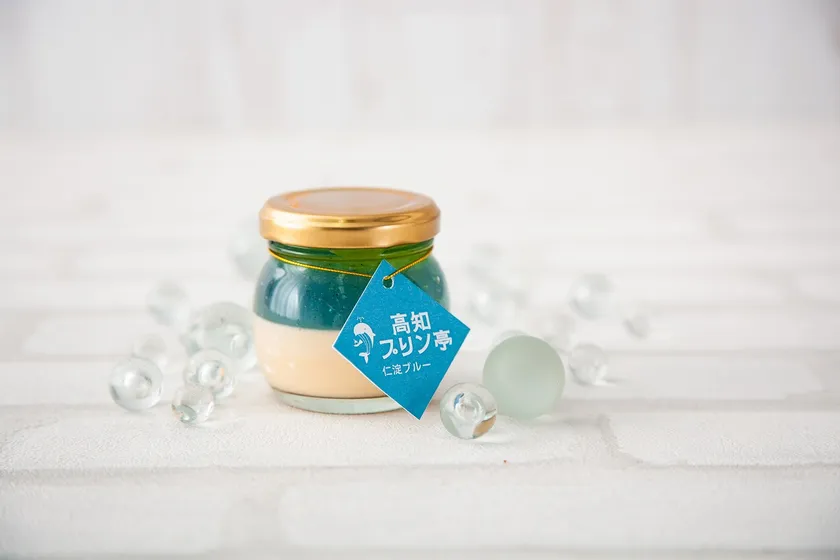 高知県の観光スポットでもある仁淀ブルーをイメージしたプリンです。日本一水のきれいな川と言われる仁淀川の輝く色合いを、青と緑のジュレで表現しました。正体はラムネ味のゼリーで、色のインパクトはもちろん、爽快なラムネがなめらかなプリンと絶妙にマッチします。