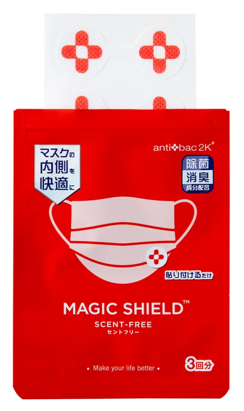 マスクの内側の空気に着目した新しい感覚のマスク内環境を快適にする除菌消臭シール。アンティバック2Kが開発したマジックボール専用ソリューションはNPO法人バイオメディカルサイエンス研究会における稼働試験により抗ウイルス除去データを持ち、その専用ソリューションの技術をマジックシールドにも搭載しています。マスクの内側に貼ることで、長時間マスクを着用することで生じる息苦しさやニオイなどの不快感を軽減し、コロナ禍の快適なマスクライフを実現します。マジックボールのカプセル化技術は新型コロナウイルスをはじめ、インフルエンザ、MERS、SARSをはじめ新型コロナウイルスといったエンベロープウイルスを包み込むという除菌消臭メカニズムでマジックシールドにも空気洗浄・除菌消臭といった研究を長年行っているアンティバック2K独自の技術が活かされています。このコロナ禍でマスクの着用がニューノーマルとなり、長時間マスクをすることが避けられない職種の方などに科学的技術によって裏打ちされた清潔で安全、快適な環境をお届けします。マジックシールドはマスクの内側に装着するだけという手軽さで除菌・消臭が期待される今までにない商品です。