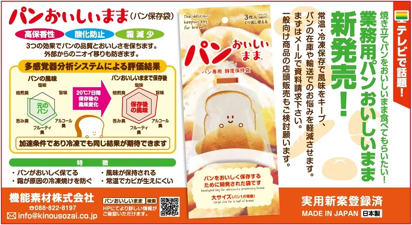 機能素材株式会社(所在地:高知県高知市、代表取締役社長:岡村 岳尚)は、パンの焼き立ての風味を逃さず保管できる袋「パンおいしいまま」の業務用を7月1日に発売しました。