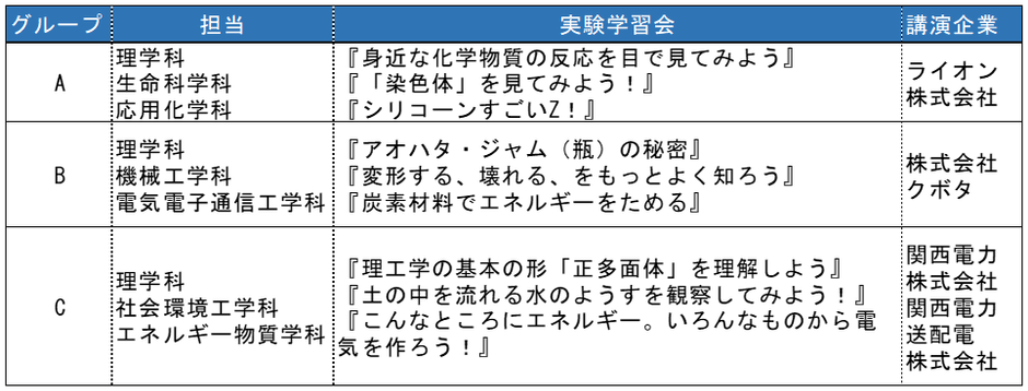 近畿大学理工学部の概要や説明、施設見学等を行い、理学科・生命科学科・応用化学科・機械工学科・社会環境工学科・電気電子通信工学科・エネルギー物質学科の教員協力のもと、グループに分かれて講演・実験を実施します。また理系分野に関連が深い企業の担当者から講演などを行います。