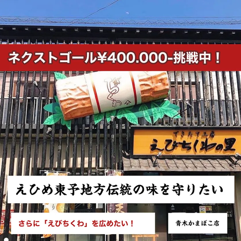 えびちくわの製造販売を行う有限会社青木蒲鉾店(本社:愛媛県四国中央市、代表取締役:青木 良臣)は、愛媛県東予地方の特産品『えびちくわ』の認知度を広め、事業継承を目的としたクラウドファンディングが、プロジェクト開始約2週間で、支援金額200,000円を突破するとともに目標金額を達成しましたことをお知らせいたします。