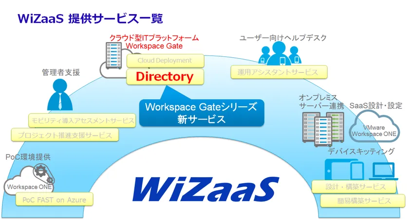 「Workspace Gateシリーズ」は、クラウド環境のSaaSからオンプレミス環境のサーバーやモバイルデバイスまで、セキュアかつシームレスに構築・運用を行うためのサービスです。「VMware Workspace ONE」とオンプレミス環境を接続するためのゲートウェイ機能をSaaS提供する「Workspace Gate Cloud Deployment」、シングルサインオンやデバイスの条件付きアクセスを簡単に実現する「Workspace Gate Directory」など、ユーザーやシステム管理者の負担を軽減する様々な機能を提供します。