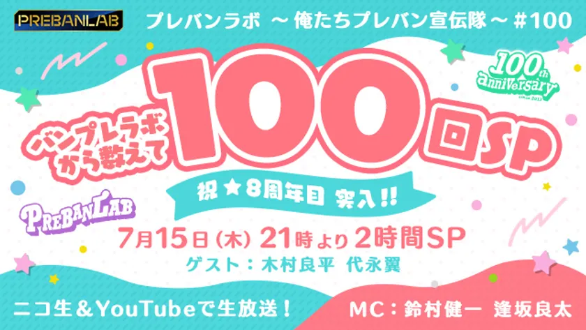 バンダイナムコグループ公式通販サイト「プレミアムバンダイ」( http://p-bandai.jp/?rt=pr )が月1で運営するプロモーション番組「プレバンラボ」( https://p-bandai.jp/prebanlab/?rt=pr )が、2021年7月15日(木)に100回目の放送を迎えます。これに伴い『プレバンラボ ~バンプレラボから数えて100回SP~』を同日21時より2時間スペシャル番組として生放送を実施いたします。ゲストは声優の木村良平さんと代永翼さんです。