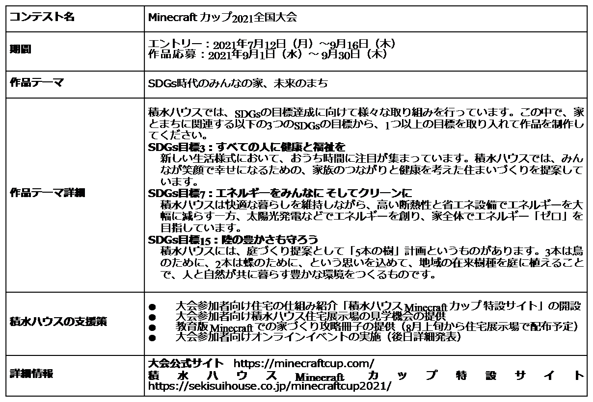 積水ハウス株式会社は、2021年7月12日(月)から開催のプログラミング教育施策「Minecraft カップ2021全国大会」に大会パートナーとして参画し、子どもたちのプログラミング思考の醸成を支援します。