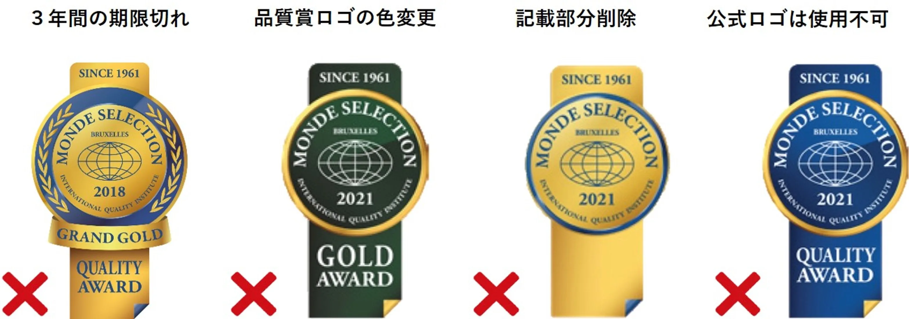 また、品質賞ロゴの色の変更や変形、品質賞の記載部分削除やその他の要素の追加、モンドセレクション公式ロゴの使用などは認められていないのでご注意ください。