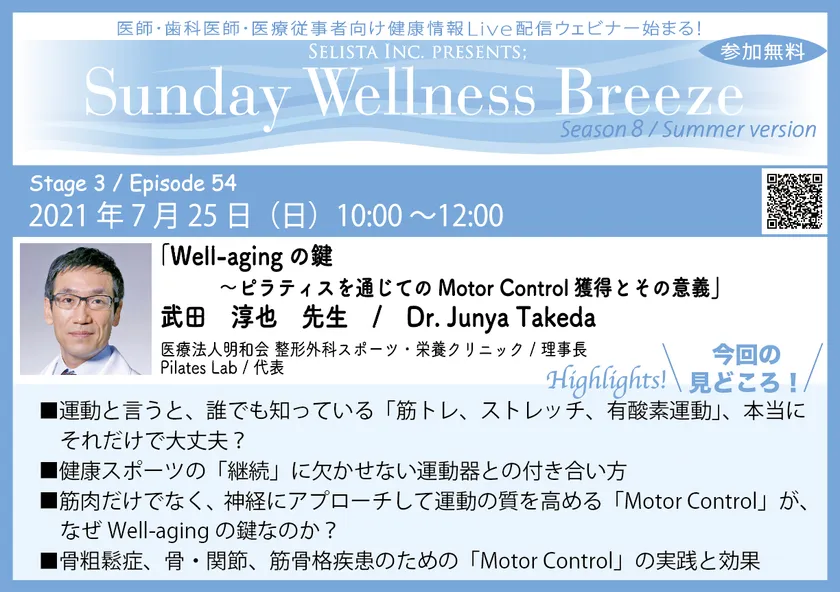 ≪医師・歯科医師・薬剤師向け無料Liveオンラインセミナー≫ 『Well-agingの鍵 ~ピラティスを通じてのMotor Control獲得とその意義』 講師:武田 淳也先生 (医療法人明和会 整形外科スポーツ・栄養クリニック / 理事長、Pilates Lab / 代表)