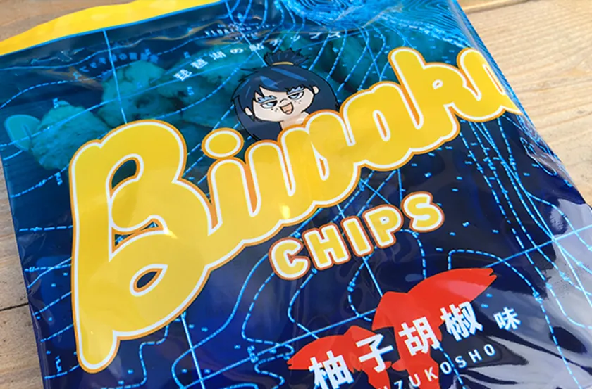 原材料に琵琶湖の鮎が入ったお菓子。柚子風味の「びわこちっぷす」と、柚子胡椒がきいた「BIWAKO CHIPS」の2種類が発売されている。「びわこちっぷす」には、琵琶湖に住む魚のイラストと豆知識カード(ヨシ紙)が、「BIWAKO CHIPS」には、琵琶湖を代表するプロアングラー(プロの釣り人)の秘密情報が描かれたカードがついている。
