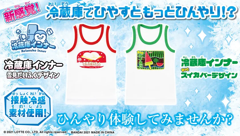 株式会社バンダイ アパレル事業部では、株式会社ロッテの「雪見だいふく」「BIGスイカバー」デザインの接触冷感素材・キッズ用インナーシャツ『冷蔵庫インナー』(各1,078円 税10%込/メーカー希望小売価格)をバンダイナムコグループ公式通販サイト「プレミアムバンダイ」内バンダイアパレルストア( https://p-bandai.jp/apparel/?rt=pr )にて2021年7月13日(火)より先行販売中、また、一部の専門店にて順次販売いたします。