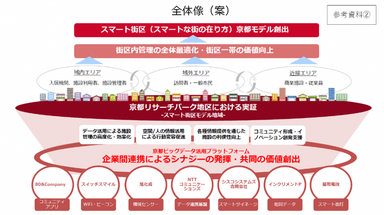 京都府は2018年11月に超快適スマート社会の創出を目的に、産官学の多様なプレイヤーと共に新規事業創出や地域課題解決を図る「京都ビッグデータ活用プラットフォーム」を立ち上げており、2021年1月には「スマート街区ワーキンググループ※3」を発足・開催し、京都リサーチパーク地区を対象としてスマート社会を実現する新規プロジェクトの始動に向け準備を進めてきました。