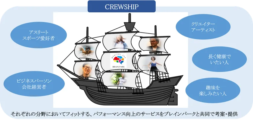 ブレインパークは、一人でも多くの人に施術体験を通じて最高のパフォーマンスや豊かな感性を取り戻すきっかけを提供することをミッションに、『CREWSHIP』制度をつくりました。ブレインパークを一隻の大きな船に見立て、各業界の第一線で活躍する人や企業が乗組員(CREW)となり、新サービスの企画や、施術効果の研究などを共同で行っていきます。ブレインパークはCREWに対して、毎月の施術(整脳コース)を無償で提供し、脳の休息と活性化に寄与し、活躍を応援します。CREWはブレインパークに対して、施術体験のフィードバックやアドバイスを行うとともに、ブレインパークの広報大使となって自らのSNSで情報発信をしていきます。