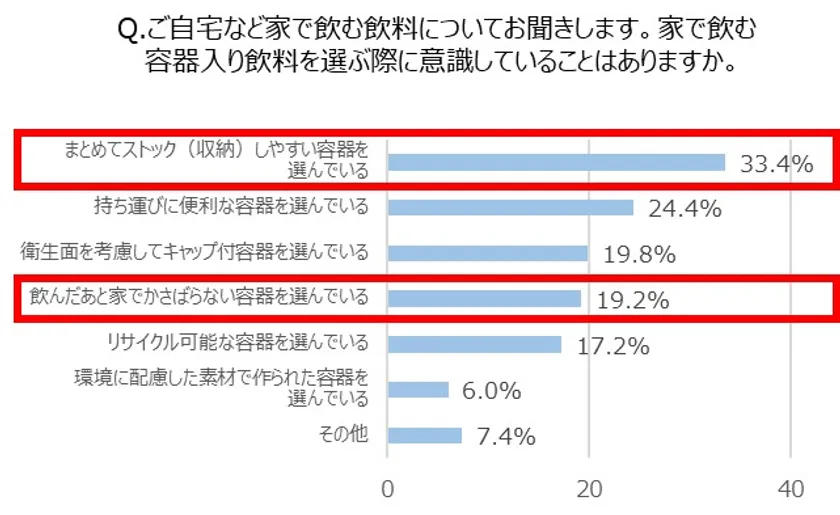 家族が一緒に過ごす時間が増える夏休みは、食材だけではなく飲料の減りも早いのではないでしょうか。忙しいママたちが家で飲む容器入り飲料を選ぶ際に意識していることとして、「まとめてストック(収納)しやすい容器を選んでいる」(33.4%)、「飲んだあと家でかさばらない容器を選んでいる」(19.2%)という回答が挙げられています。