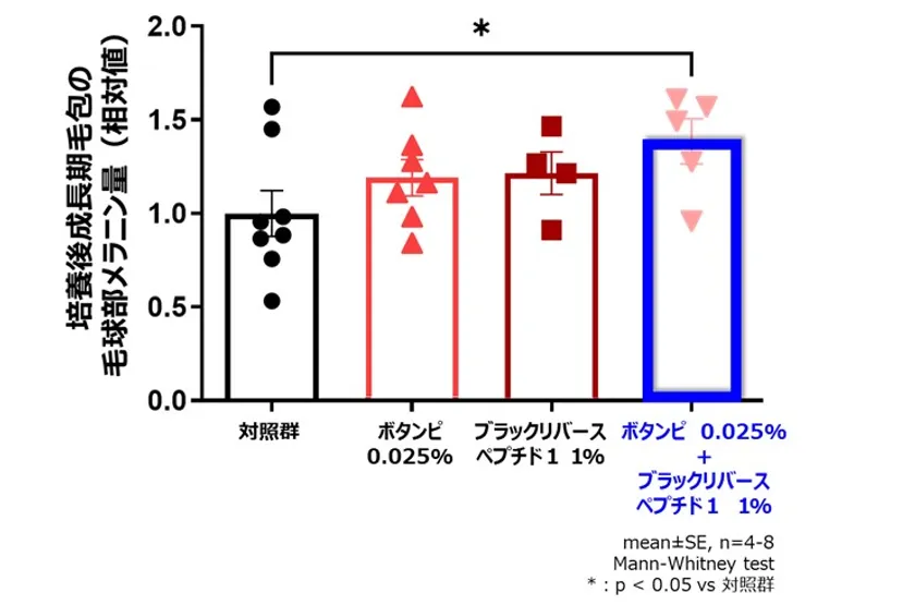 今回、「ボタンピエキス」の色素細胞でのMITOL発現上昇(図1)を、「ブラックリバースペプチド1」がさらに高めること(図5)、「MITOL活性化成分:ボタンピエキス」と「ブラックリバースペプチド1」を組み合わせることにより、毛包中でのメラニン含量(図2)が対照群と比較して有意に増加することを新たに見出しました(図6)。