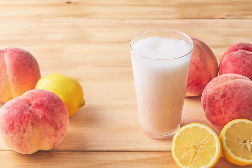 桃は抗酸化作用等が期待できるビタミンEや便秘解消の効果が期待できる食物繊維などの栄養素を含むほか、レモンにはビタミンCも比較的豊富に含まれ、おいしく爽やかにビタミン補給をしていただけるフレッシュジュースです。