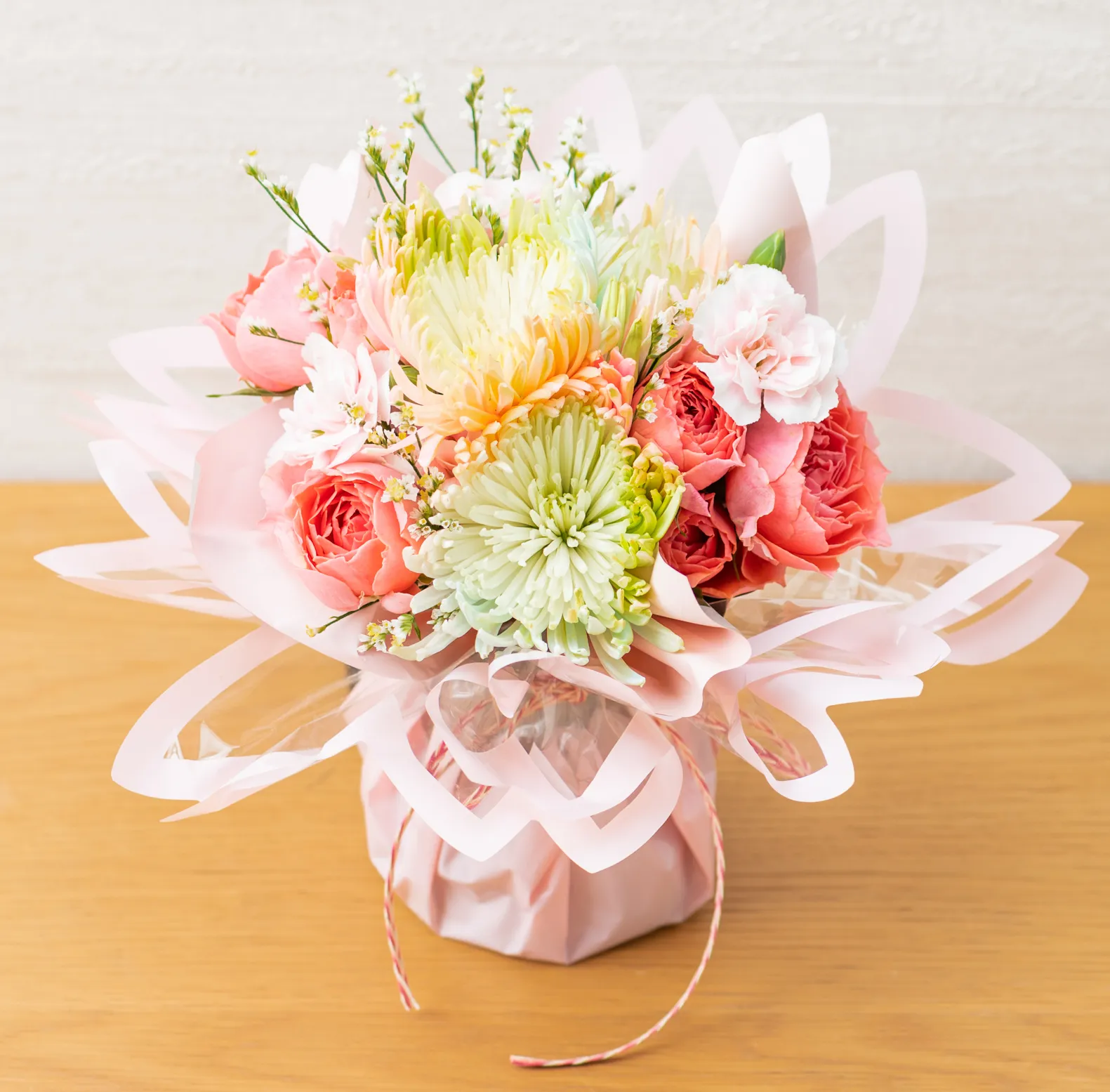 いつも頑張っているあの人に「フレーフレー」とエールを届ける応援ブーケ。優しい色合いのレインボーマムと桜をイメージしたラッピングのそのまま飾れるブーケは、花瓶に入れる手間要らずで、見る人をそっと癒してくれる花束です。頑張っている大切な方に、これから頑張ろうとしている方にぜひどうぞ。