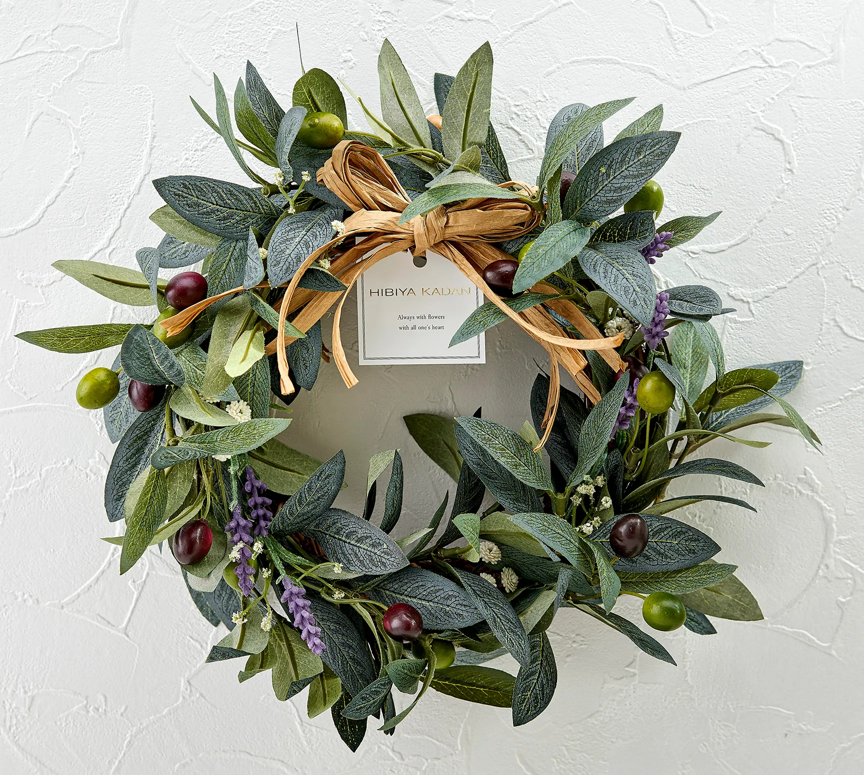 花材: アーティフィシャルフラワー(オリーブガーランド、ラベンダー、小花)