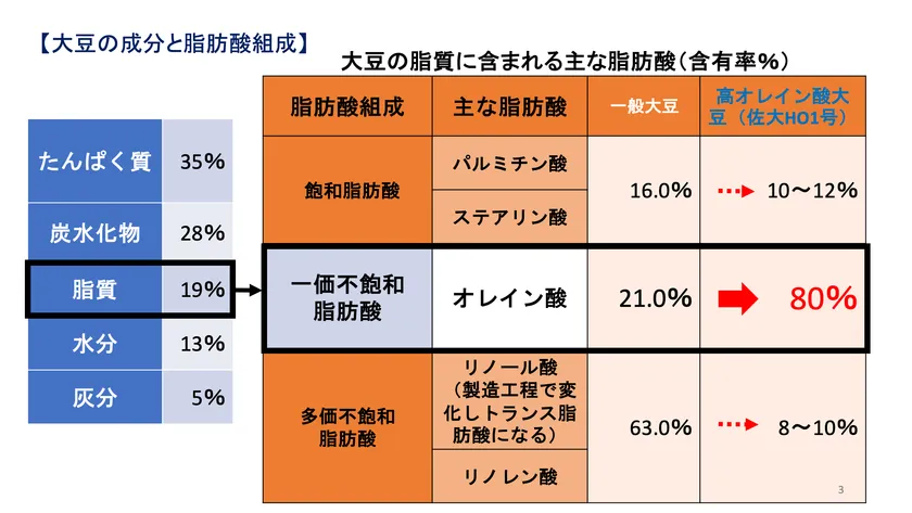 大豆の脂質に含まれる主な脂肪酸の中にオレイン酸があり、高オレイン酸大豆は一般的な大豆の約4倍のオレイン酸が含まれます。