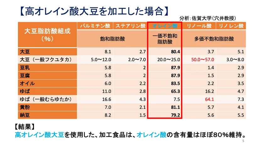 高オレイン酸大豆は加工をしてもオレイン酸の含有率がほぼ維持されるという結果が出ております。