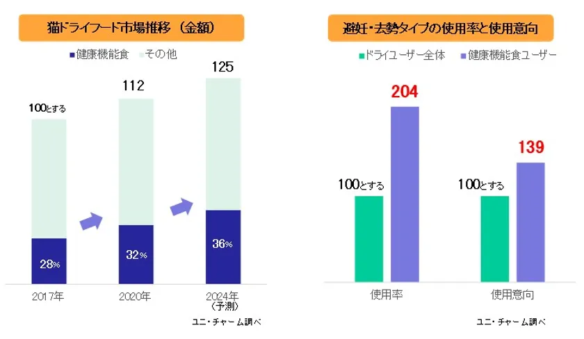 愛猫への健康意識の高まりから、拡大しているドライキャットフード市場における「健康機能食」の構成比が年々増加しています。特に、健康機能食ユーザーの愛猫の避妊・去勢率は高く、避妊・去勢タイプの商品の使用率・使用意向も高い状況にあります。一方で、“食べ悩み”や“味変え”ニーズは高く、フレーバーの充実に関して高い重視度を示しています。