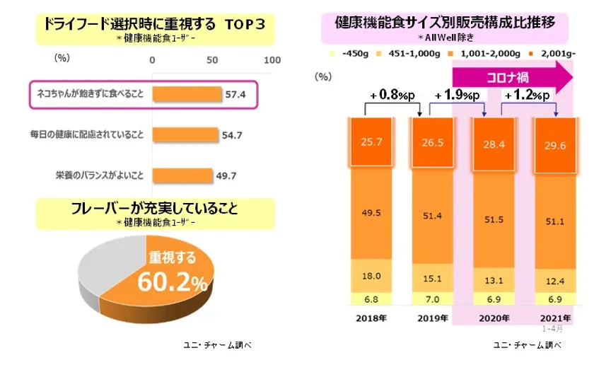 また、コロナ禍における買い物頻度の減少から、健康機能食の大容量構成比も高まっています。